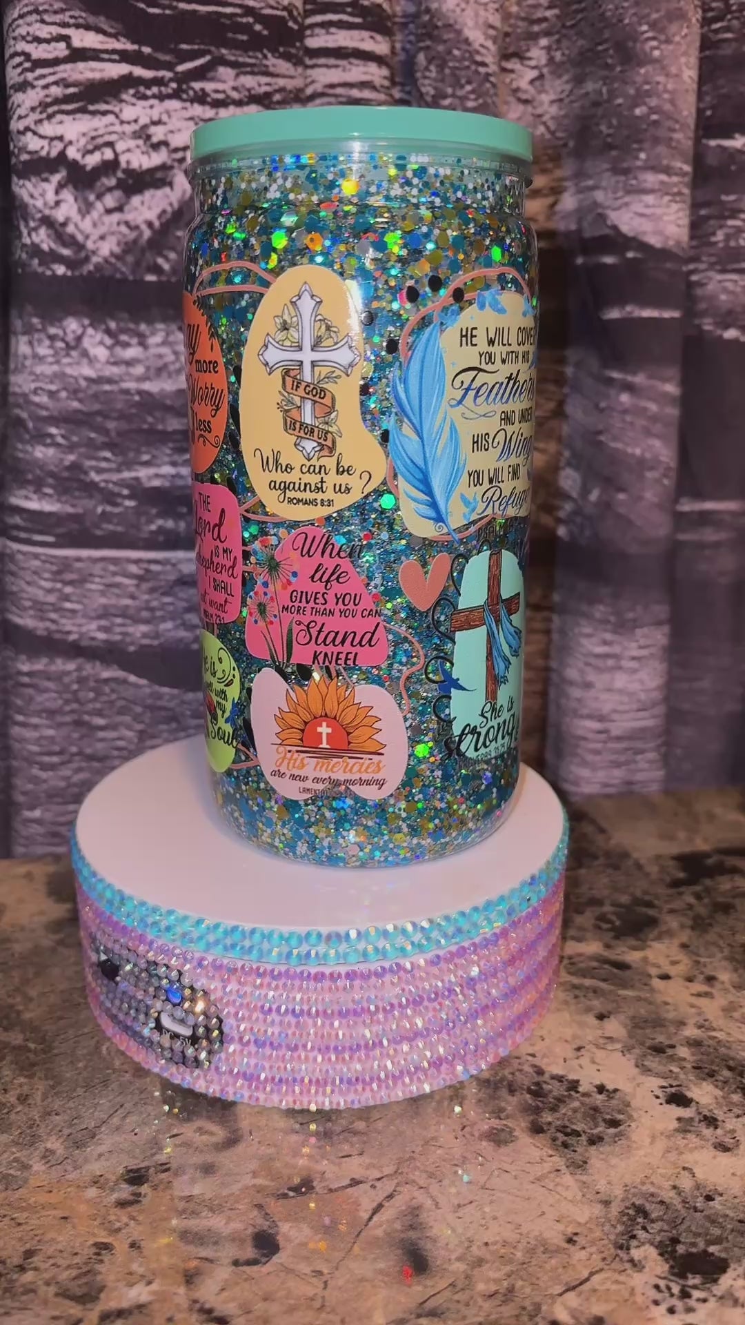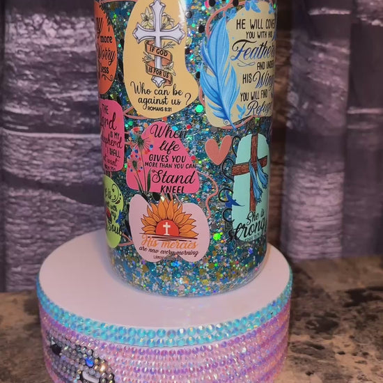 This image shows a glittery tumbler with various illustrated designs and quotes on it. It features religious motifs, such as a cross and feathers, and a quote that appears to be from a religious text. The tumbler has a vibrant and colorful appearance, set against what looks like a glitter background.