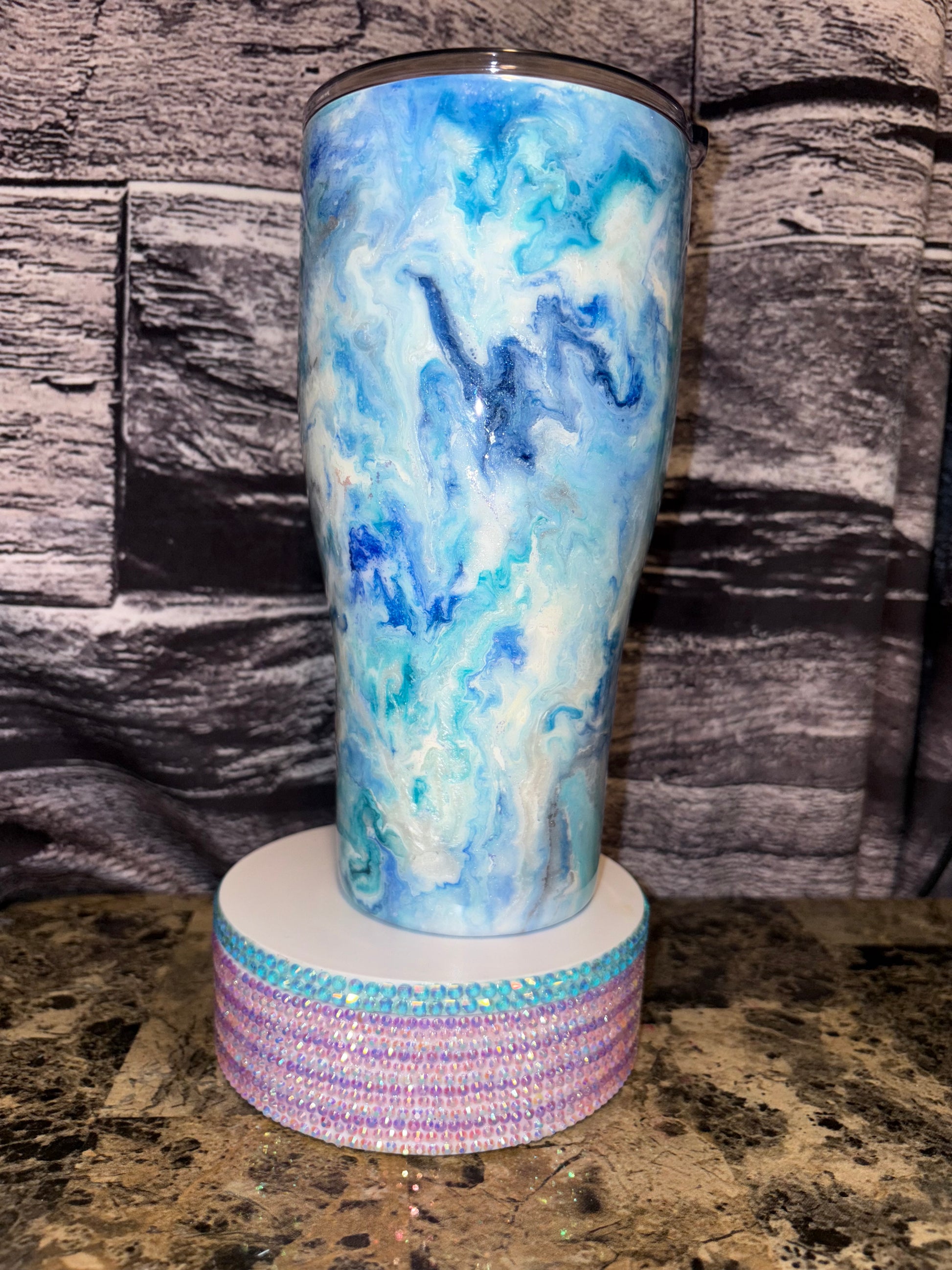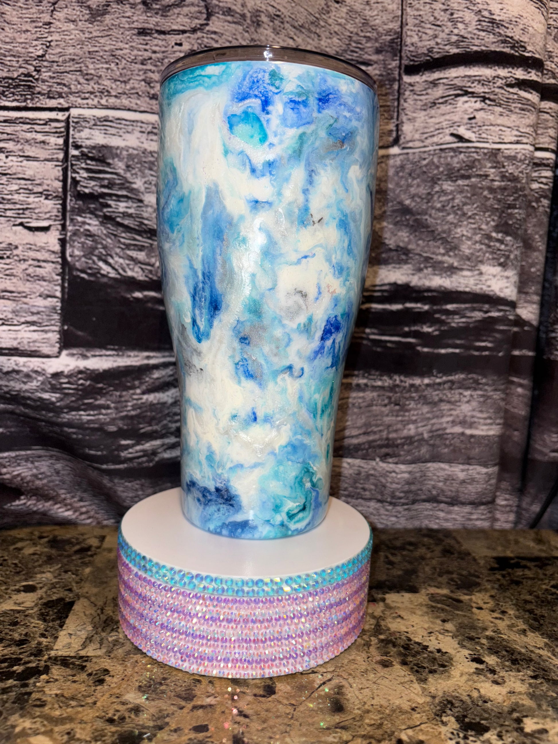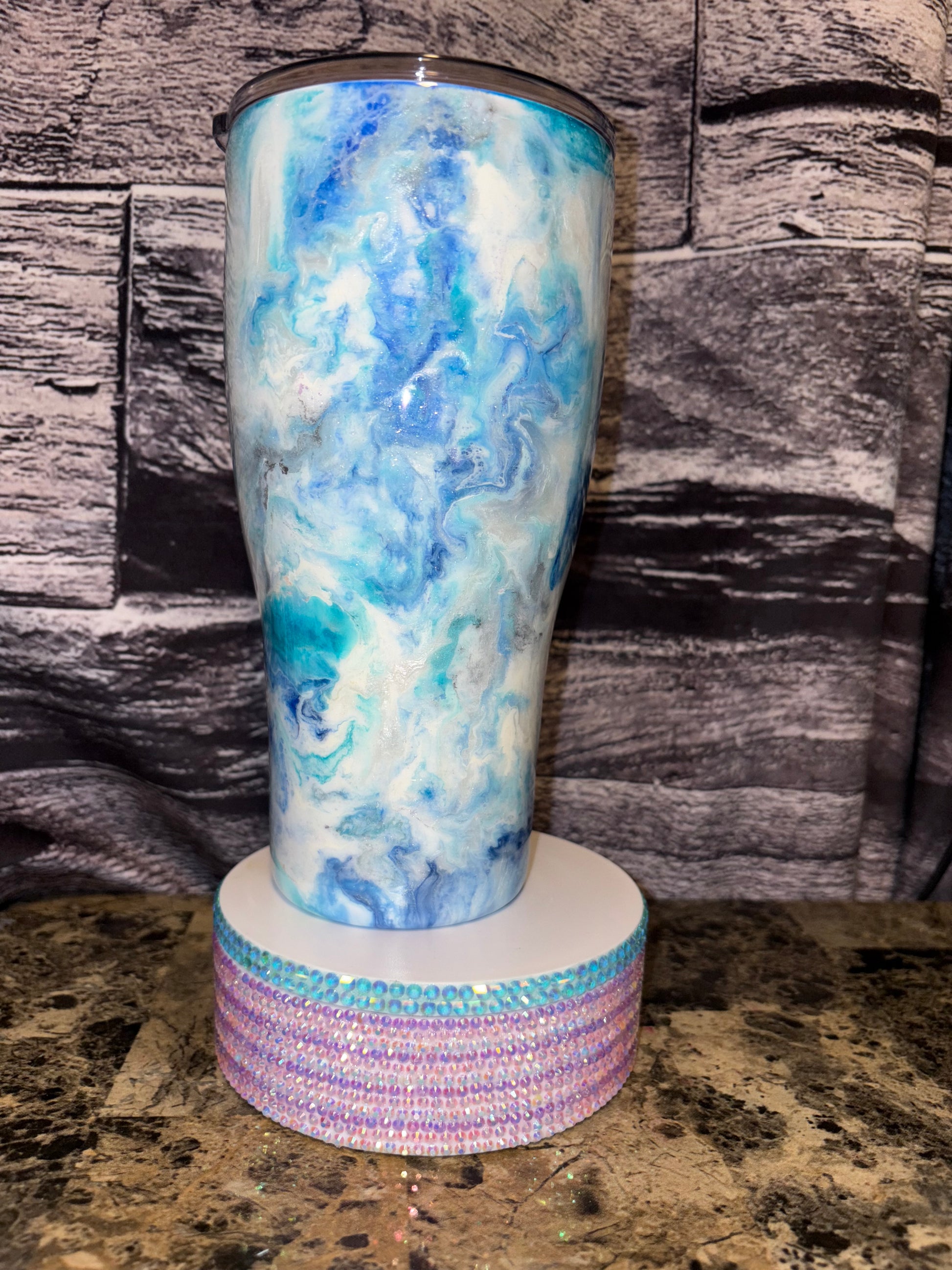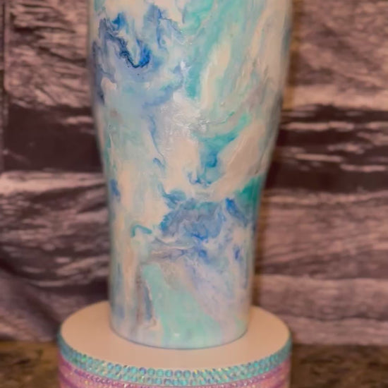 Check out my latest project! This beautiful tumbler features a stunning blend of blue and white hues, creating a mesmerizing marbled effect. Each swirl adds a unique touch, making it one-of-a-kind!